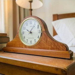 Opis: Klasyczny drewniany zegar kominkowy z mechanizmem zasilanym na baterie. Elegancka obudowa wzorowana na klasycznym typie zegara typu „napoleon”. Gładkie, błyszczące wykończenie o wysokim połysku. Boki i podstawa w kolorze czarnym, front i tył pokryty fornirem w kolorze dobrze usłojonego drewna czereśniowego wykończone gładko o wysokim połysku. Czarna, lekko profilowana podstawa osadzona na niewielkich okrągłych nóżkach Elementy metalowe w kolorze złotym. Mechanizm umieszczony w plastikowej skrzynce z dostępem od tyłu zegara. Mechanizm kurantów umieszczony w podstawie zegara.