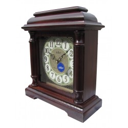 Klasyczny drewniany zegar kominkowy z mechanizmem zasilanym na baterie. Elegancka obudowa zbliżona kształtem do kwadratu. Ozdobne filarki drewniane wzdłuż bocznych krawędzi zegara. Tarcza ozdobna, koloru srebrna antycznego z wyraźnie wyszczególnioną obręczą cyferblatu, cyfry wyraźne w białych okręgach. Mechanizm umieszczony w plastikowej skrzynce z dostępem od tyłu zegara.
