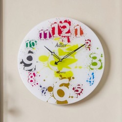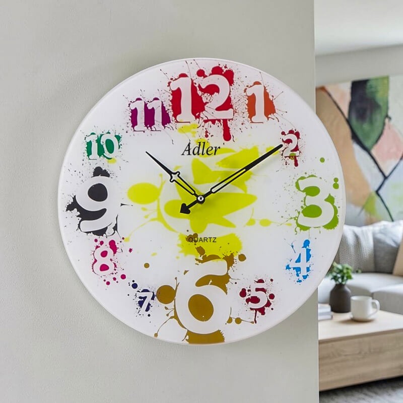 Nowoczesny zegar ścienny  z mechanizmem zasilanym na baterie. Zegar okrągły szklany. Na szklanej tarczy fantazyjnie rozrzucone kolorowe arabskie cyfry godzin.