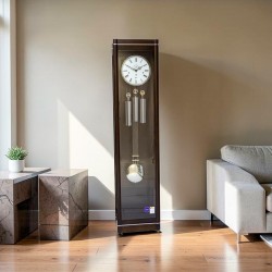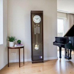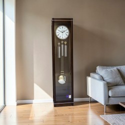Reprezentacyjny zegar gabinetowy odznaczający się klasycznym kształtem oraz zaawansowanym technologicznie mechanizmem Hermle 1161 decyduje o jego wyjątkowości. Prosta podstawa i góra zegara przełożona srebrną ozdobą .Piękna biała emaliowana tarcza z rzymskimi cyframi i czarnymi stylizowanymi wskazówkami, sekundnikiem .Wahadło w kolorze srebra oraz wagi dopełniają całości.